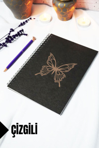 A5 Kelebek Temalı Siyah Kraft Kapaklı Defter - Çizgili Defter - 60 yaprak (120 sayfa) 15x21 cm