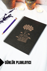 A5 Uçan Ev Temalı Siyah Kraft Kapaklı Defter - Günlük Planlayıcı - 45 Yaprak (90 SAYFA) 15x21 Cm
