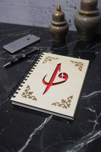 Elif Vav Desenli Ahşap Kapaklı Defter - Ajanda - Günlük - Çizgisiz Hediyelik Defter