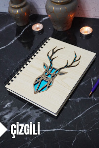 Geyik Figürlü Ahşap Kapaklı Defter - Çizgili Defter - Ajanda - Okul Defteri (A5 - 120 Sayfa)